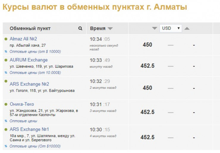 По данным kurs.kz на 10.30, покупка в большинстве обменников установилась на уровне 448-450 тенге за доллар. Обменные пункты Алматы покупают американскую валюту за 450-452,5 тенге.