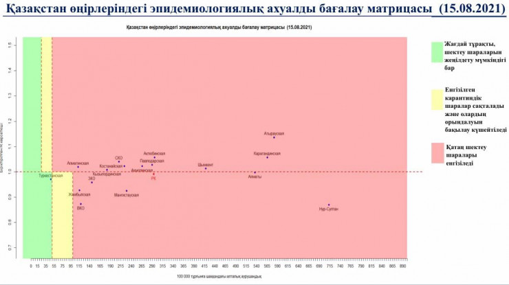 По состоянию на утро 15 августа все регионы находятся в "красной" зоне. Исключение составила Туркестанская область, которая вчера находилась в "желтой" зоне, а сегодня перешла в "зеленую".