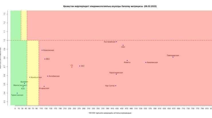 В "красной" зоне на 6 февраля находятся: Нур-Султан, Алматы, Атырауская, Алматинская, Акмолинская, Актюбинская, Восточно-Казахстанская, Западно-Казахстанская, Карагандинская, Костанайская, Павлодарская, Северо-Казахстанская области.