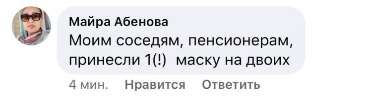 Публикацию о необычном презенте разместил на своей странице в Facebook блогер Яков Федоров. Мужчина сообщил, что его маме, которая живет одна, принесли одну маску представители городского акимата.