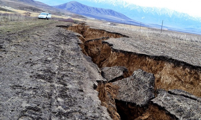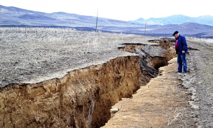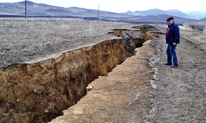 Огромная водомоина, напоминающая геологический разлом, образовалась на месте полевой дороги в результате интенсивного таяния снега на участке Караозек в Солоновском сельском округе Катон-Карагайского района ВКО, пишет altaynews.kz.