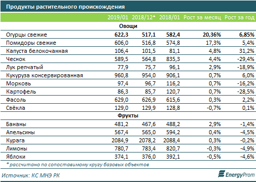 За январь 2019 года серьезно увеличились цены на несезонные свежие овощи - огурцы (+20,4 процента за месяц) и помидоры (+17,3 процента). Также выросли цены на капусту (+4,8 процента), чеснок (+4,4 процента) и лук (почти +3 процента). Цены на "зимние" овощи длительного хранения - картофель, морковь, фасоль - выросли менее чем на 1 процент за месяц. Упала в цене лишь свекла. Среди фруктов заметно подорожали бананы - на 2,9 процента за месяц, а цены на яблоки и лимоны сократились, впрочем, лишь менее чем на 1 процент за месяц.