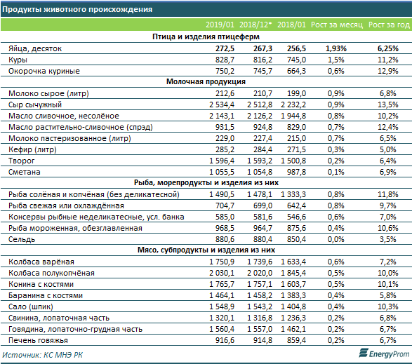 Продукты животного происхождения за месяц почти не изменились в цене. Среди продукции птицеферм к февралю текущего года цены выросли менее чем на 2 процента за месяц. Цены на молочную продукцию увеличились менее чем на 1 процент за месяц. Подобная картина наблюдается и среди изделий из мяса и рыбы.
