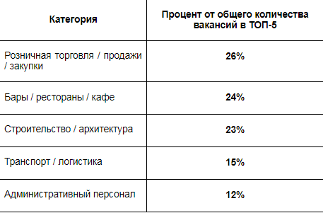 Традиционно высокой популярностью пользуются заведения общественного питания. В этой сфере размещено 24 процента вакансий и 18 процентов резюме из числа ТОП-5. Самые востребованные позиции: официанты, повара, кухонные работники, администраторы заведений. Встречаются и необычные предложения: например, в некоторые кафе требуются исполнители живой музыки.