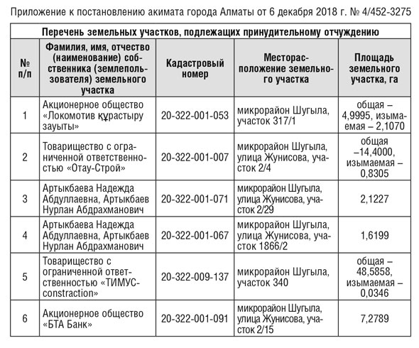 По всем вопросам собственники изымаемых земель могут обратиться в исполнительный орган - Управление земельных отношений Алматы (УЗО) по адресу: улица Толе би, 155, кабинет 514.
