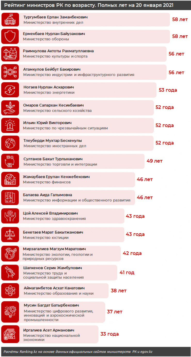 Среди министров Казахстана самыми возрастными являются министр внутренних дел Ерлан Тургумбаев и министр обороны Нурлан Ермекбаев. Им обоим по 58 лет.