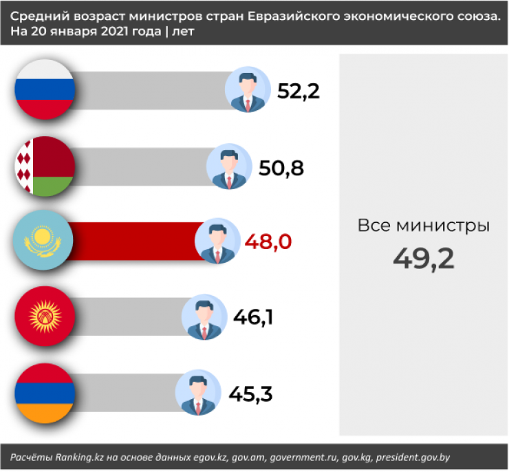 По данным аналитиков, самые молодые министры ЕАЭС работают в Армении: средний их возраст составил 45,3 года. А самые возрастные министры - в России: здесь средний возраст составил 52,2 года.