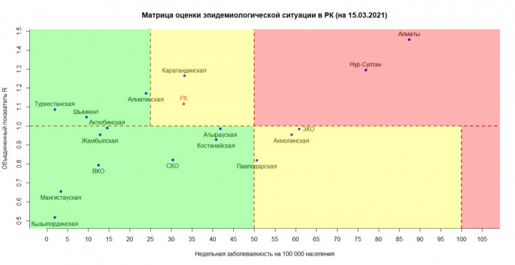 Появилась матрица оценки эпидемиологической ситуации в регионах Казахстана на 15 марта.