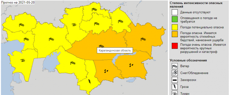Ранее синоптики "Казгидромета" предупреждали, что в Акмолинской, Павлодарской, Карагандинской областях ожидается дождь, днем местами сильный дождь. 19-20 мая местами гроза, шквал, град. 20-21 мая местами туман. 19-21 мая ветер северо-восточный с переходом на северо-западный, местами 15-20 метров в секунду, 19-20 мая порывы 25 метров в секунду. Днем 19-20 мая ожидается резкое понижение температуры воздуха до 12-20 тепла. Ночью 20-21 мая местами заморозки 2 градуса.