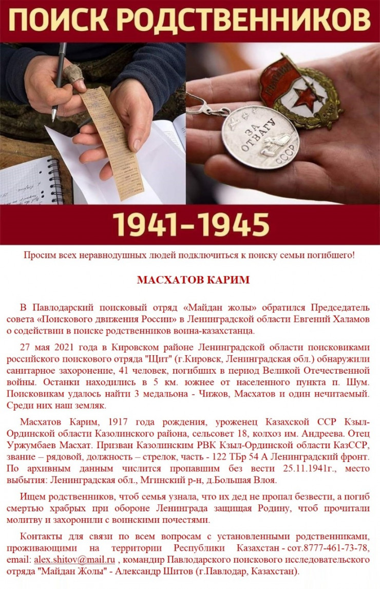 На публикацию о поиске семьи погибшего кызылординца, найденного российскими поисковиками в санитарном захоронении в Ленинградской области, откликнулся родственник погибшего Байболат Алдамбергенов.