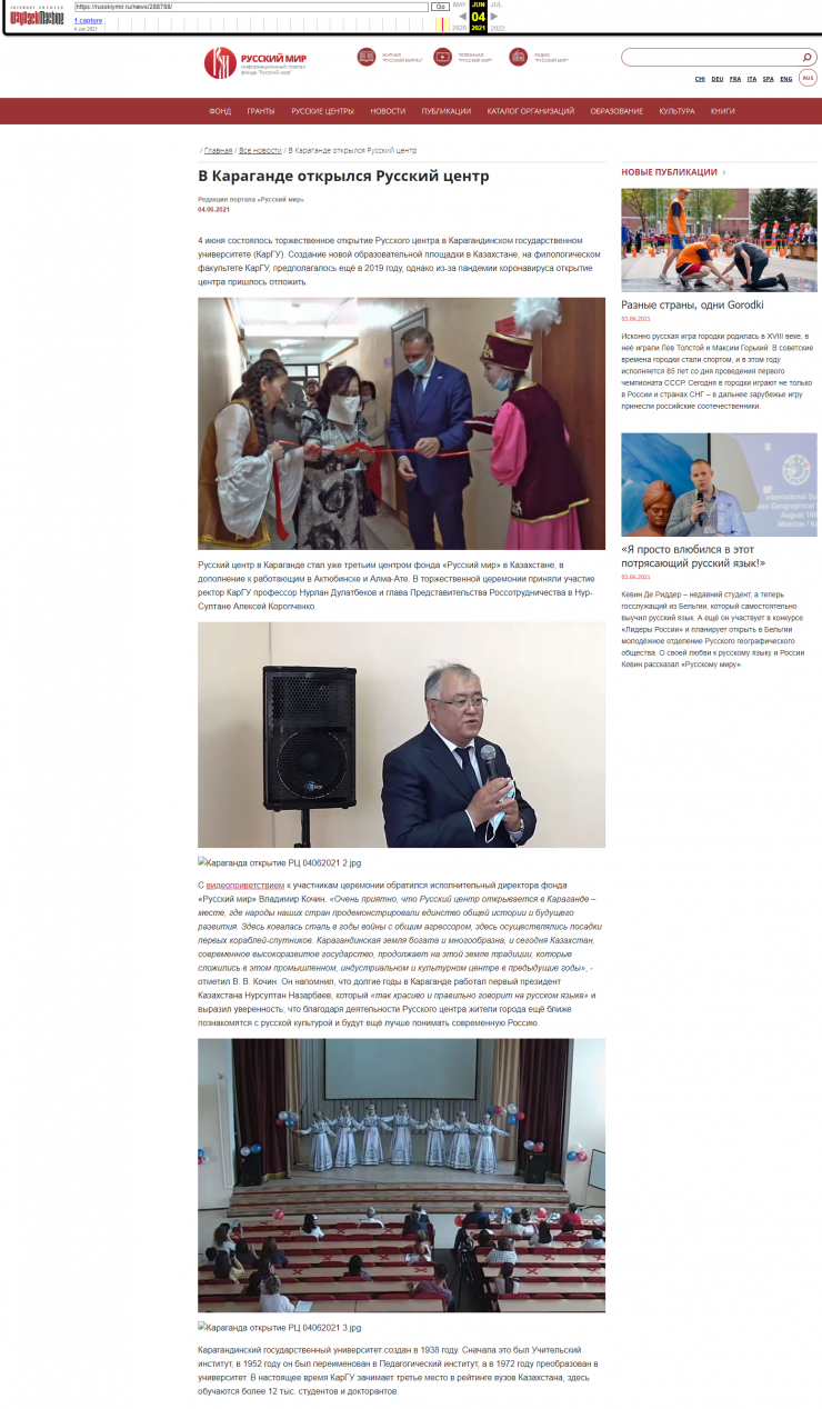 Центр русского языка был открыт в Карагандинском университете имени Букетова 4 июня. Карагандинские общественники заподозрили его связь с "Русским миром", после того как на официальном сайте фонда появилась информация об этом. Однако вскоре она была удалена. Но в Сети остались скриншоты, которые опубликовал ряд СМИ, а по запросу Google выдает ссылку на эту новость, размещенную ранее на сайте фонда, и надпись - "элемент не найден".