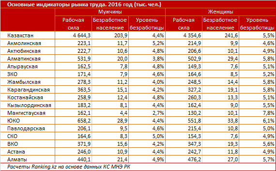 Примечательно, что по регионам РК показатели рынка труда сильно разнятся. Так, к примеру, в Мангистауской области в 2016 году наблюдался самый высокий уровень трудоустроенности мужчин (безработных - всего 2,7 процента), и в то же время - самый слабый показатель для женщин (безработных - 7,8 процента, худший показатель по РК).