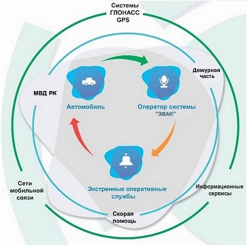 В целом работа системы "ЭВАК" выглядит следующим образом: Небольшое встроенное в автомобиль устройство срабатывает во время ДТП при ударе. Автоматически, по сотовой сети, координаты местонахождения машины передаются в центр единой дежурно-диспетчерской службы "112. Также устанавливается голосовая связь. Диспетчер узнает у водителя подробности случившегося. Если ответа не последовало, то на место автоматически отправляются службы экстренного реагирования. Также на устройстве имеется кнопка SOS, с помощью которой водитель сам может выйти на связь с оператором в экстренной ситуации.