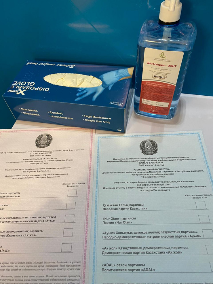 Вот так выглядят бюллетени в столице. Красный для выборов в маслихат города, синий - для голосования в Мажилис. На столиках перчатки и антисептик.