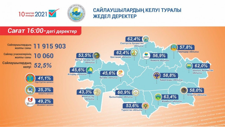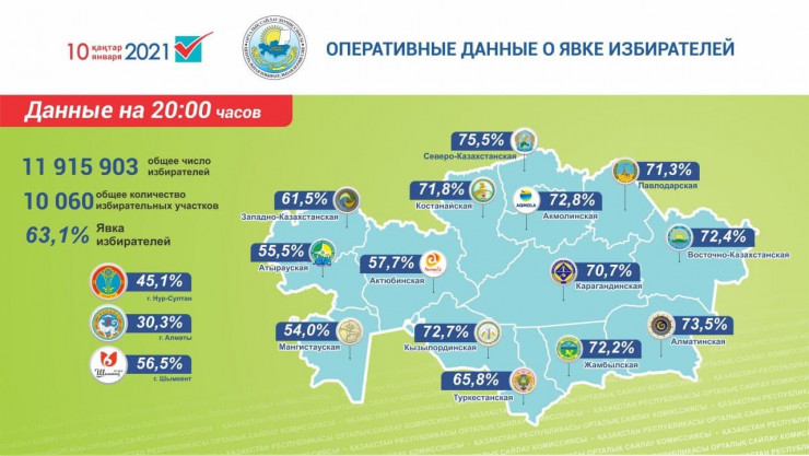 Голосование на территории Казахстана проходило с 7.00 до 20.00. Центризбирком огласит предварительные итоги по явке в 22.00. После полуночи должны появиться данные экзитполов. Окончательные итоги должны подвести до 17 января.