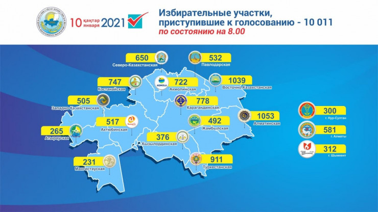 В 8 часов по времени столицы к голосованию приступили все 9994 избирательных участка по стране и 17 при представительствах Казахстана в иностранных государствах. 49 избирательных участков за рубежом приступят к голосованию с учетом разницы часовых поясов. В списки избирателей на начало голосования включено 11 915 903 избирателя. Об этом сообщил заместитель председателя ЦИК Константин Петров.