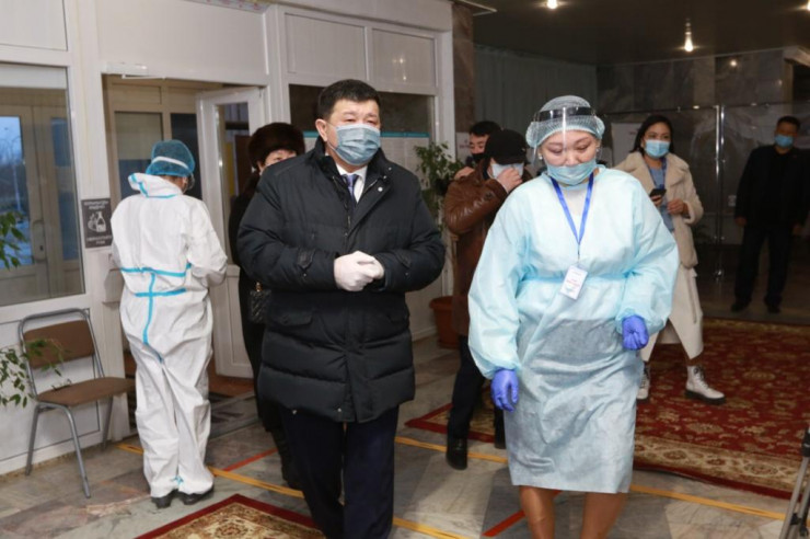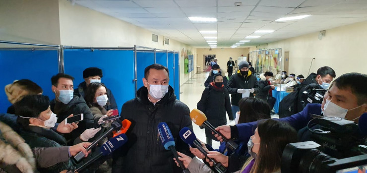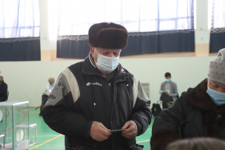 Проголосовал аким Алматы Бакытжан Сагинтаев. Он спустил маску и показал удостоверение, чтобы получить свой бюллетень.