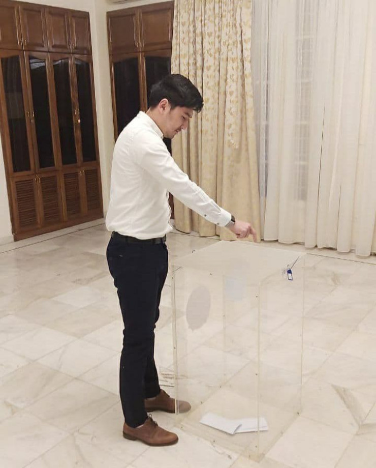 А это пресс-секретарь Елбасы Айдос Укибай на избирательном участке в театре "Астана Опера".