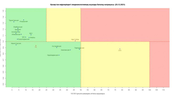 в "зеленой" зоне: Алматы, Шымкент, Акмолинская, Атырауская, Актюбинская, Алматинская, Западно-Казахстанская, Туркестанская, Жамбылская, Кызылординская, Карагандинская, Костанайская, Мангистауская, Павлодарская, Восточно-Казахстанская области.