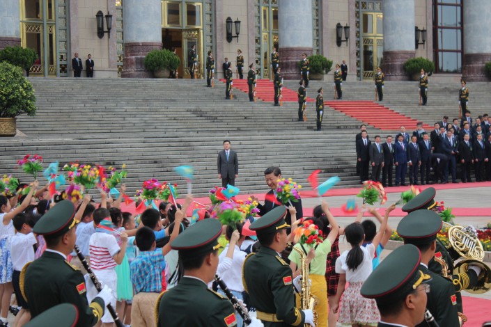 Торжественная церемония встречи Нурсултана Назарбаева по случаю его государственного визита в КНР началась с того, что к зданию Всекитайского собрания народных представителей его подвезли на автомобиле "Красный флаг" - машине для самых высоких лиц.
