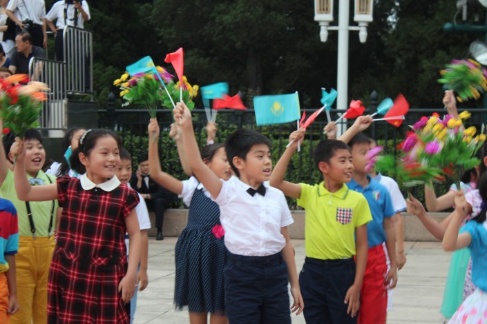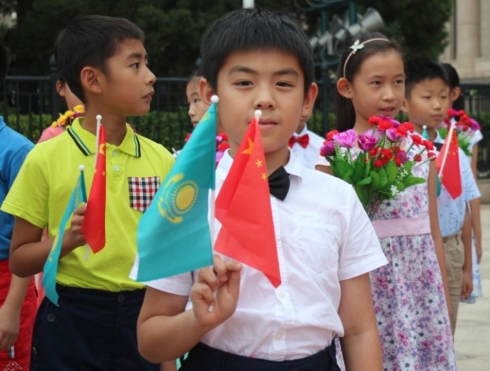 После чего Президент РК в сопровождении своего китайского коллеги проследовал к группе детей, которые, размахивая флагами двух стран, громко приветствовали гостя.