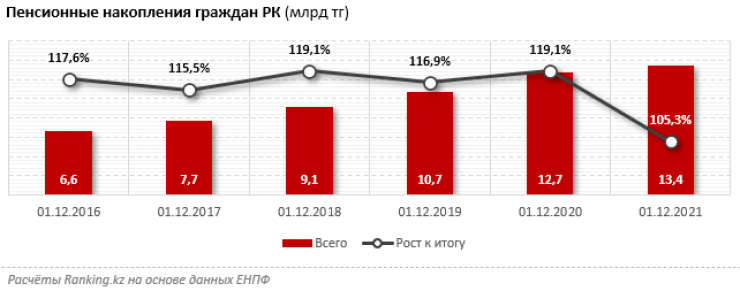 По данным ЕНПФ, к 1 декабря размер пенсионных накоплений казахстанцев достиг 13,4 триллиона тенге. За год эта сумма возросла на 5 процентов, на 648 миллиардов, несмотря на изъятие части средств гражданами для покупки жилья и улучшения здоровья.