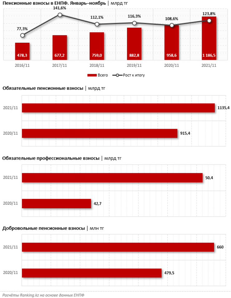 Аналитики отмечают, что увеличение объема пенсионных взносов наблюдается по всем направлениям. Так, по обязательным пенсионным взносам (ОПВ) за 11 месяцев текущего года поступило 1,1 триллиона тенге (рост за год составил 24 процента). По обязательным профессиональным пенсионным взносам (ОППВ) поступило 50,4 миллиарда (рост за год - 18 процентов). Также наблюдается значительный рост объема добровольных пенсионных взносов (ДПВ) — сразу на 38 процентов за год, до 660 миллионов тенге.