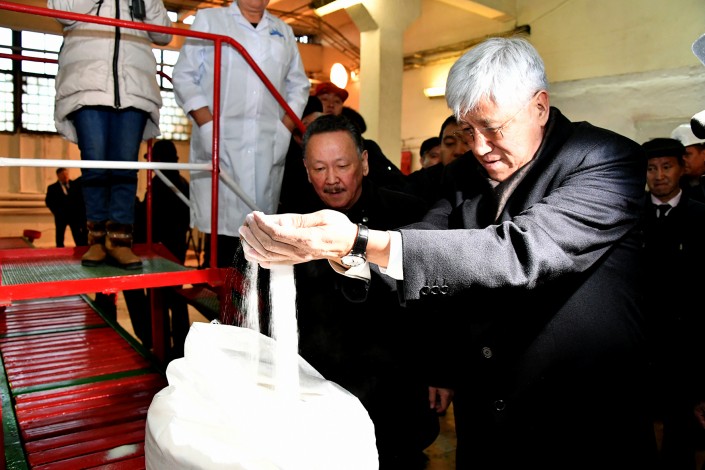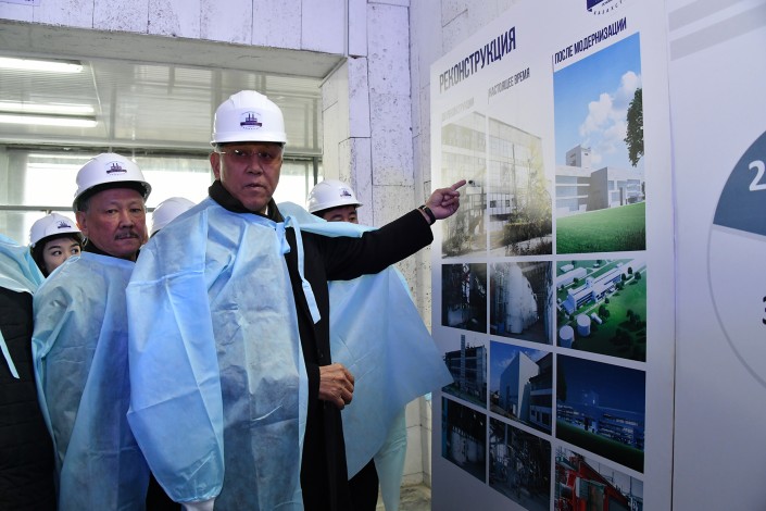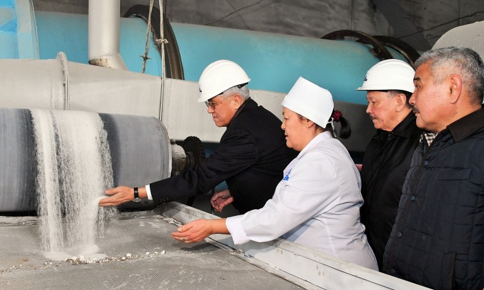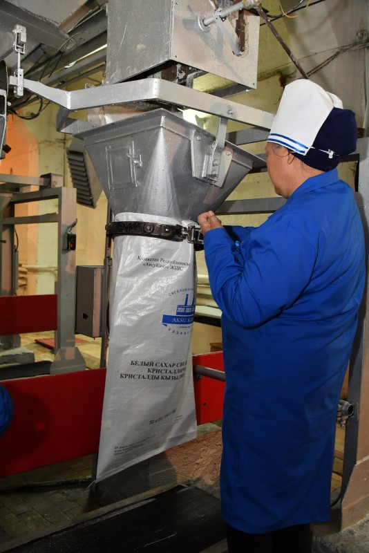 Знакомясь с итогами налаженной производственной деятельности завода, аким области Амандык Баталов посетил все цехи предприятия и оценил сахар, полученный на заводе после его почти десятилетнего простоя.