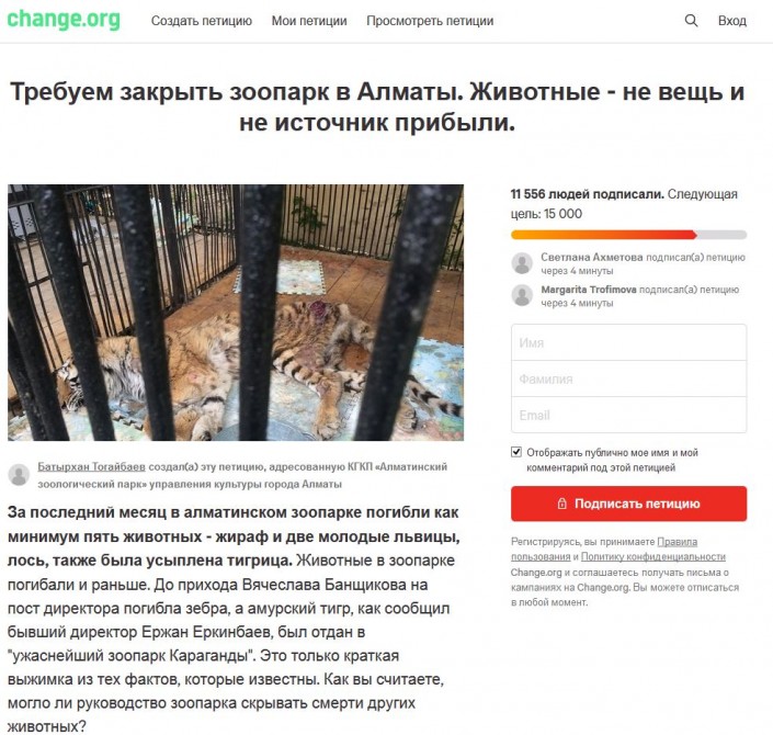 "За последний месяц в алматинском зоопарке погибли как минимум пять животных - жираф и две молодые львицы, лось, также была усыплена тигрица. Животные в зоопарке погибали и раньше. До прихода Вячеслава Банщикова на пост директора погибла зебра, а амурский тигр, как сообщил бывший директор Ержан Еркинбаев, был отдан в "ужаснейший зоопарк Караганды", - пишет Батырхан Тогайбаев.