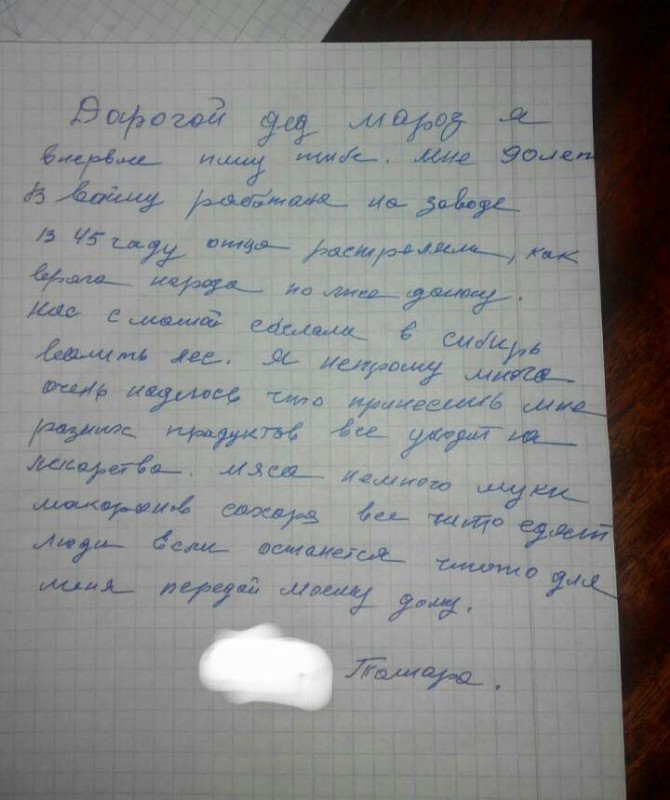 "Дорогой Дед Мороз, я впервые пишу тебе. Мне 90 лет, в войну работала на заводе, в 45-м году отца расстреляли как врага народа по доносу. Нас с мамой сослали в Сибирь, валить лес. Я не прошу много, надеюсь, что принесешь мне разных продуктов, все уходит на лекарства. Мяса, немного муки, макарон, сахара, все, что едят люди. Если останется что-то для меня, передай моему дому", - говорится в письме бабушки Тамары.