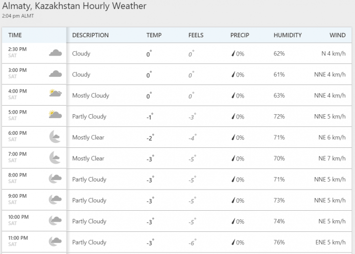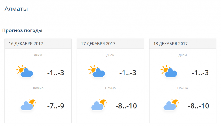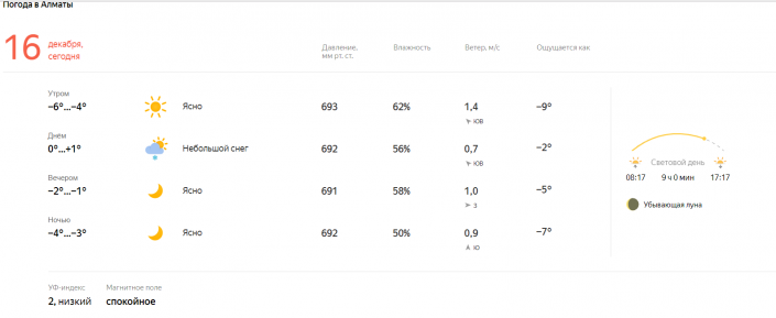 В Алматы в День Независимости Казахстана, 16 декабря 2017 года, зафиксирована плюсовая температура воздуха. Об этом свидетельствуют данные порталов Accuweather.com, Weather.com, Yr.no и Yandex.kz, передает корреспондент Tengrinews.kz.