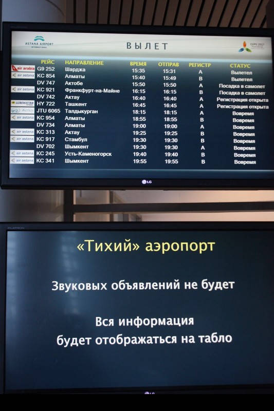 Как пояснили корреспонденту, новшество было внедрено с целью уменьшения шумового воздействия в терминале аэропорта. "В сутки в среднем с аэропорта Астаны осуществляется 55 регулярных рейсов на прилет и столько же на вылет по 37 направлениям. Объявление занимает 1-1,5 минуты, которое повторяется каждые 15 минут, один рейс объявляется 15 раз на трех языках. Учитывая постоянный рост количества рейсов, в дальнейшем голосовые сообщения объявлять будет невозможно по причине того, что данные сообщения создадут сбойную ситуацию в терминале", - добавили в аэропорту.