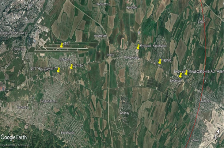 Звероводческие фермы, скотобойни в радиусе 15 километров от контрольной точки аэродрома Алматы