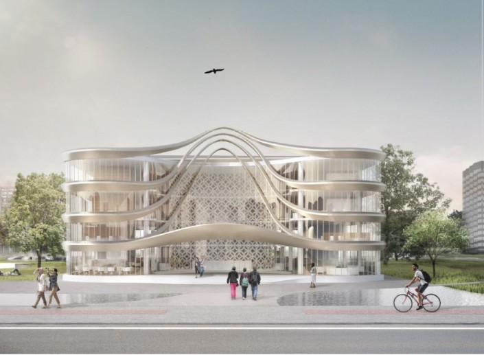 Областная научно-универсальная библиотека. Ее строит акимат Шымкента. Внешне здание площадью 2 600 квадратных метров напоминает книжные страницы.