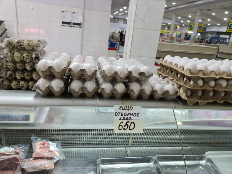 В Семее и Абайской области ощутимо повысились цены на овощи и фрукты. Баклажаны хорошего качества не в сезон стоят 1200-1600, цена на болгарский перец в магазинах у дома достигает 1700. Мандарины, привезенные из Египта и Аргентины, стоят 1900-2129 тенге, турецкие - 1365. Яйца куриные продаются по цене от 552 до 685 за десяток в зависимости от производителя, категории и места продажи. Весовой сахар стоит 550-600 тенге за килограмм в супермаркетах, где продается расфасованный по 2-3 килограмма. Весовой репчатый лук стоит от 130 до 160 тенге. Цена за литр рафинированного подсолнечного масла составляет от 888 по акции до 2500. Цены на помидоры варьируются от 779 тенге по акции до 1100-1300 тенге, на огурцы - 759-1100 тенге.