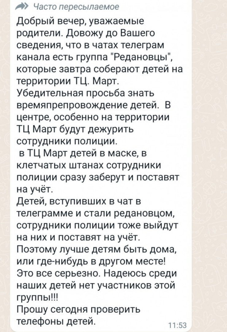"Редановцы носят брюки в клетку, длинные черные волосы и одежду с четверкой на белом пауке. Эта символика взята из популярного японского аниме-сериала "Хантер х Хантер". Такие татуировки там делали себе члены банды "Пауки". Вообще это аниме - сказка со своими героями и злодеями. Завтра лидеры данной субкультуры планируют встречу в центре ТРЦ МАРТ и "КОСТАНАЙ ПЛАЗЕ". Будет усиление со стороны полиции! Убедительная просьба не отпускать детей на подобные мероприятия! Классные руководители 5-11 классов, донесите информацию до родителей", - написали анонимы в мессенджерах.