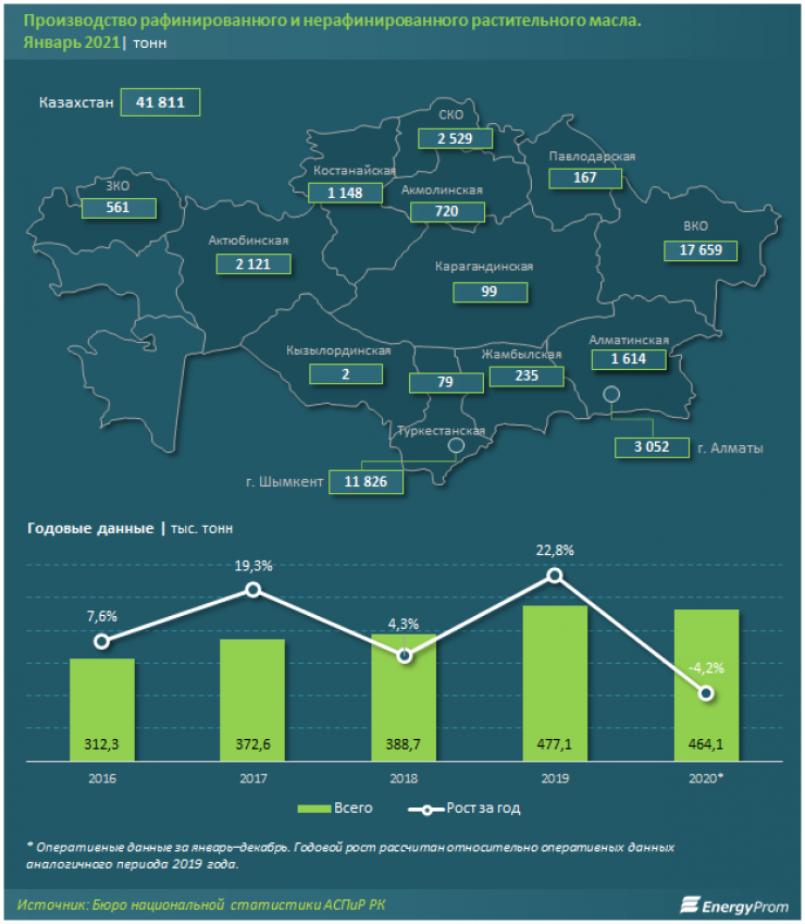 В целом за январь – декабрь 2020 года компании произвели 464,1 тысячи тонн растительного масла - ненамного меньше (на 4,2 процента), чем в январе – декабре 2019-го.
