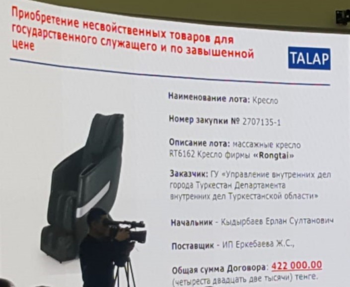 "Вот в настоящий момент Управление внутренних дел Туркестана хочет закупить кресла массажные суммой 422 тысячи. Зачем массажное кресло по такой большой цене, мы недоумеваем... Вот подобная система мониторинга позволяет на ранней стадии выявлять и как минимум информировать исполнителей, организаторов закупок, что их закупки выглядят не очень красиво", - заявил член специальной мониторинговой группы.