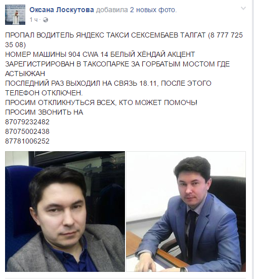 В Facebook появилась информация о пропаже Талгата Сексембаева, который занимается частным извозом.