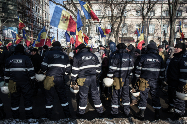 Полицейские Молдовы носят синюю форму с белыми полосками и надписью "Politia".