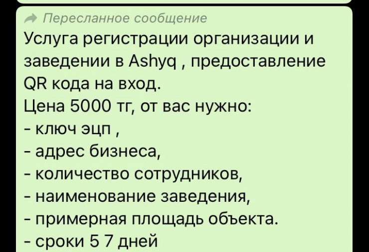 В распространяемом сообщении предлагается заплатить 5 тысяч тенге за регистрацию организаций и заведений в Ashyq и предоставление специального QR-кода.