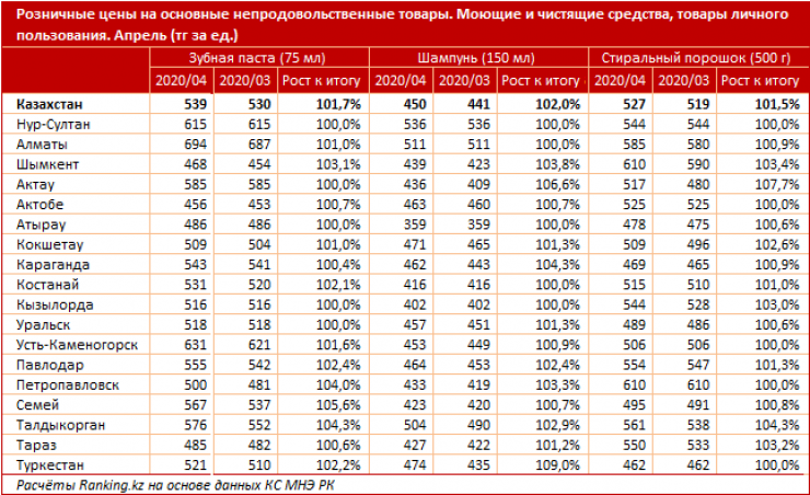 Розничные цены на моющие и чистящие средства, а также товары личного пользования выросли за год на 7,7–17,6 процента, передает корреспондент Tengrinews.kz со ссылкой на Ranking.kz.