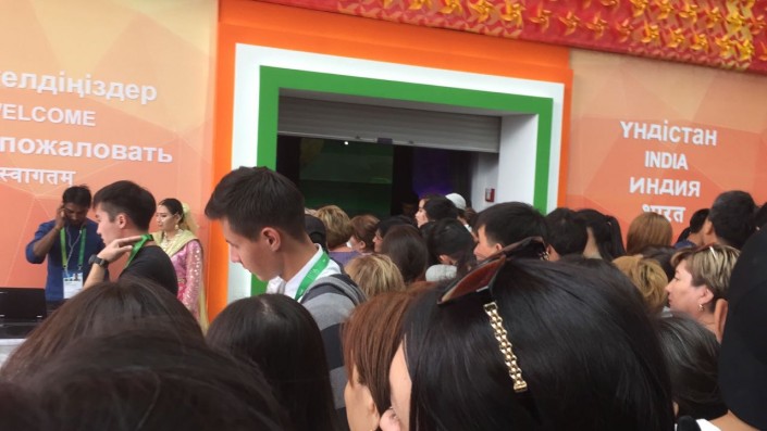 Но на территории выставки становится понятно, что ажиотаж наблюдается на входе практически во все павильоны, особенно в казахстанский павильон "Нур Алем".