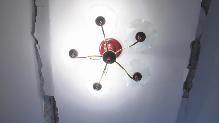 Сейчас Галина Ташкенбаева с детьми ходит по гостиной только вдоль стен, по периметру. Выходить в центр комнаты страшно, признается женщина. Центральная плита на потолке прогнулась и в середине на 5-6 сантиметров ниже остальных. Штукатурка обваливается. По плите пошли поперечные трещины.