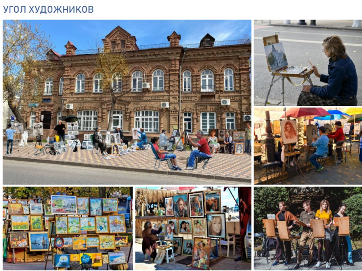 Далее по пешеходной улице, которая будет перекрываться для автомобилей по выходным, будет установлена торгово-выставочная площадка с шатрами. Появится и угол художников, места для игры в шахматы и чтения, игровые площадки, зона мороженого, зона для занятий гимнастикой.