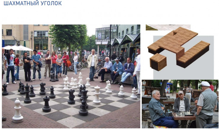 Планируется установить необычные инсталляции, барные столы и организовать фотозоны из арт-объектов. Появится уличная мебель и малые архитектурные формы.