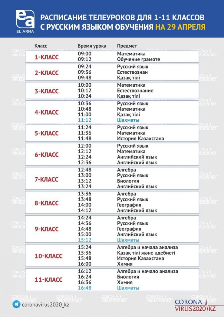 В Министерстве образования и науки озвучили расписание телеуроков для 1-11-х классов с русским и казахским языками обучения на 29 апреля, передает Tengrinews.kz.