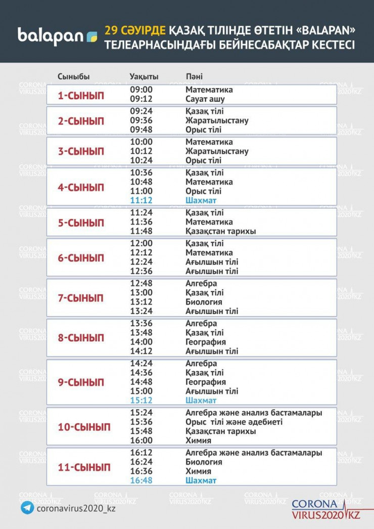 Расписание телеуроков для 1-11-х классов с казахским языком обучения на телеканале "Балапан".