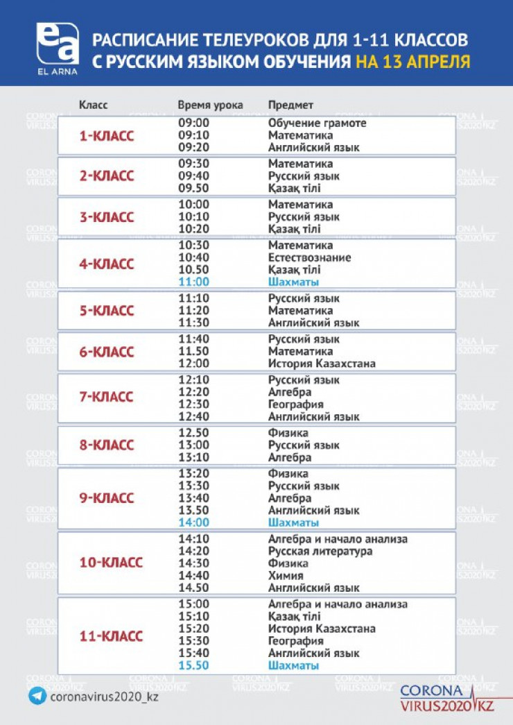 Расписание телеуроков для 1-11 классов с русским языком обучения на 13 апреля на телеканале EL ARNA.