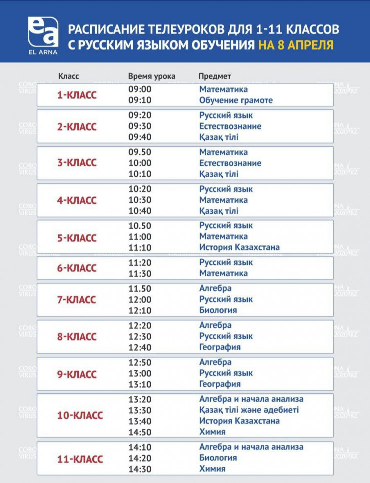 Появилось расписание телеуроков для 1-11 классов с русским языком обучения на 8 апреля на телеканале EL ARNA, передает  Tengrinews.kz со ссылкой оперативный штаб госкомиссии.